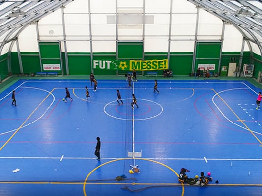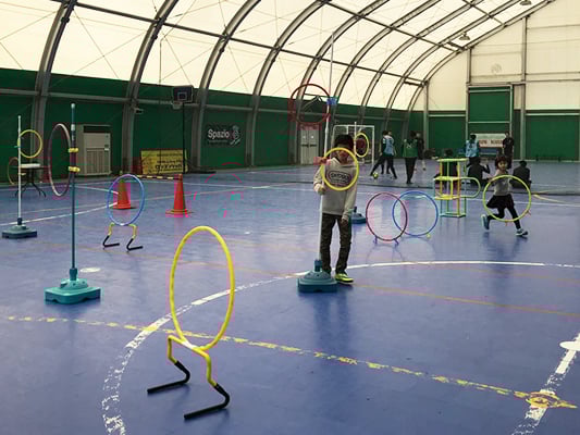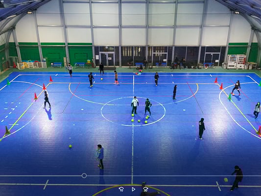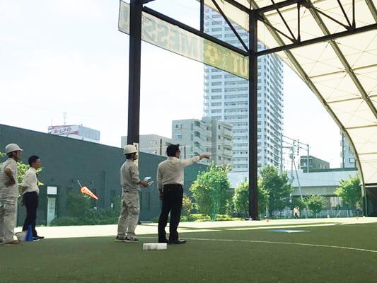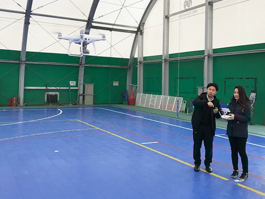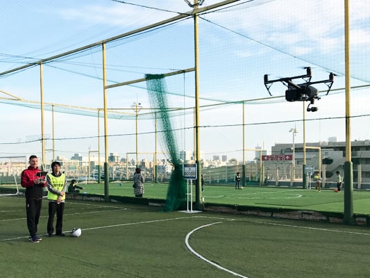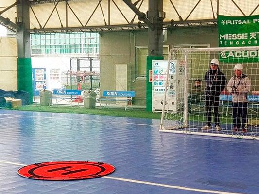ネットで囲まれたフットサルコートで安全飛行講習が可能です。航空法適用外になることから、講習団体、企業、教育機関、行政など、多数、ご利用していただいております。